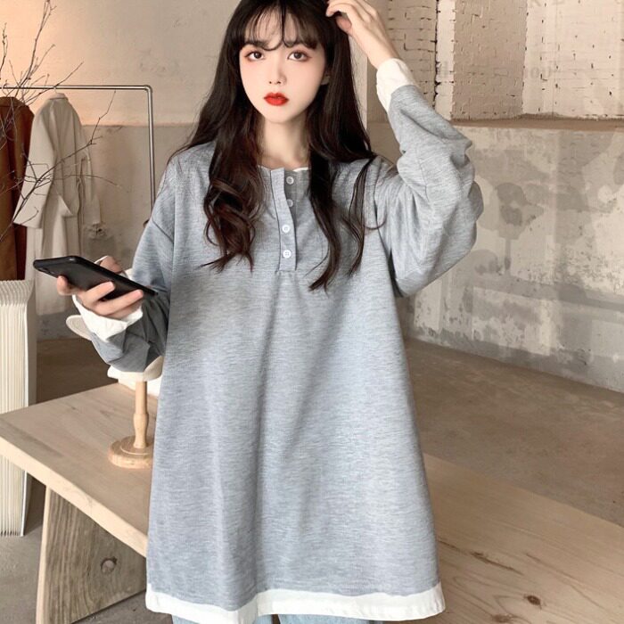 实拍2021新款韩版假两件别致长袖上衣小众超火设计感中长款6535棉热门设计联盟服务商