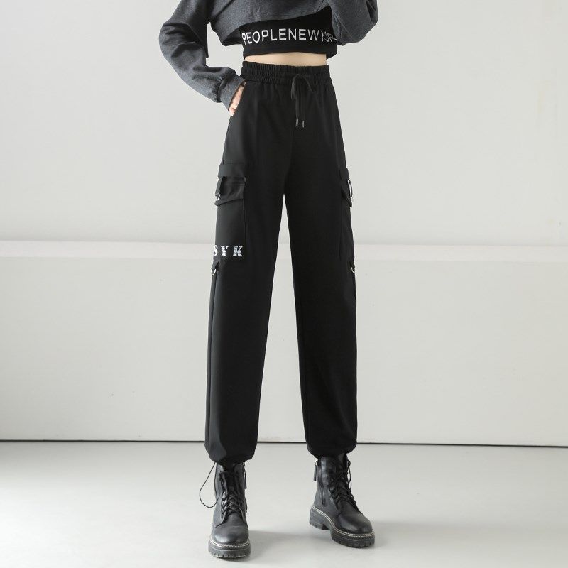 黑色工装裤女显瘦高腰2021年春秋新款法式休闲直筒宽松束脚运动裤热门设计联盟服务商
